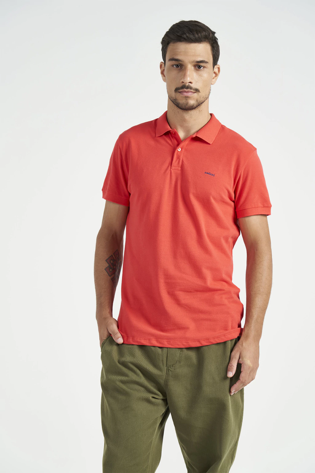Camisa apresenta shape slim com modelagem de alfaitaria. A peça possui gola polo, peitilho com botões, mangas curtas com detalhe de listras e bordado de logo na altura do peito.